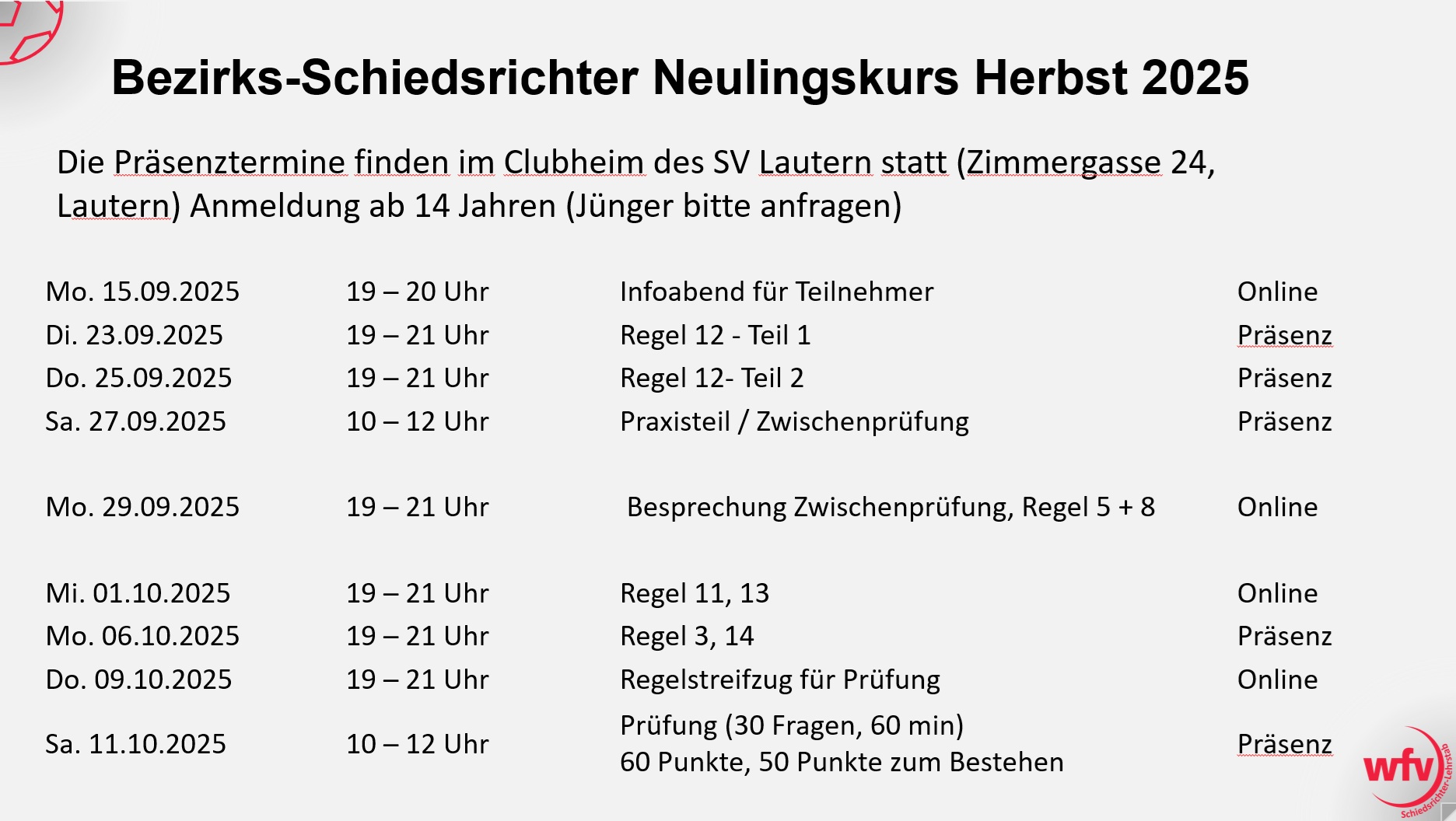 Schiedsrichter Neulingskurs Die Schiedsrichtergruppe Aalen veranstaltet im Herbst 2025 wieder einen Schiedsrichter Neulingskurs. Über mehrere Abende bzw. Samstags stattfinden....